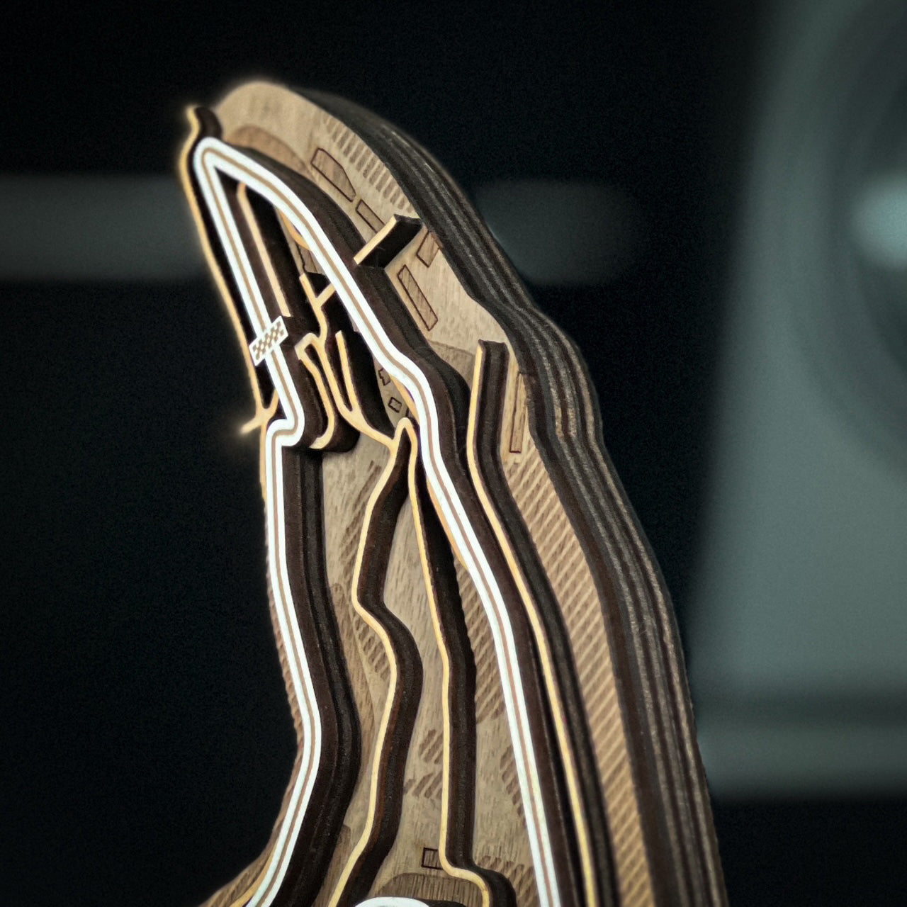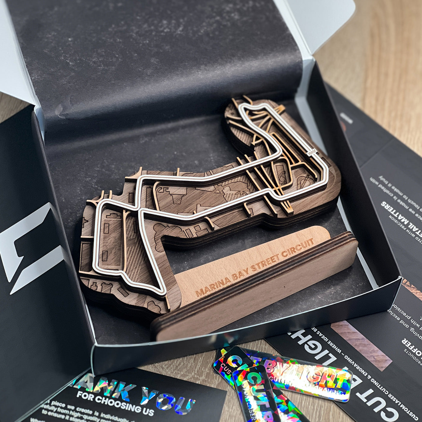 Feel the thrill of motorsport in your home or office. This 3D wooden racetrack artwork combines precision-cut beech roads with a walnut base, laser-engraved for stunning detail. The engraved racing stripe makes your track pop, creating a dynamic centerpiece that’s perfect for décor or gifting a motorsport fan.