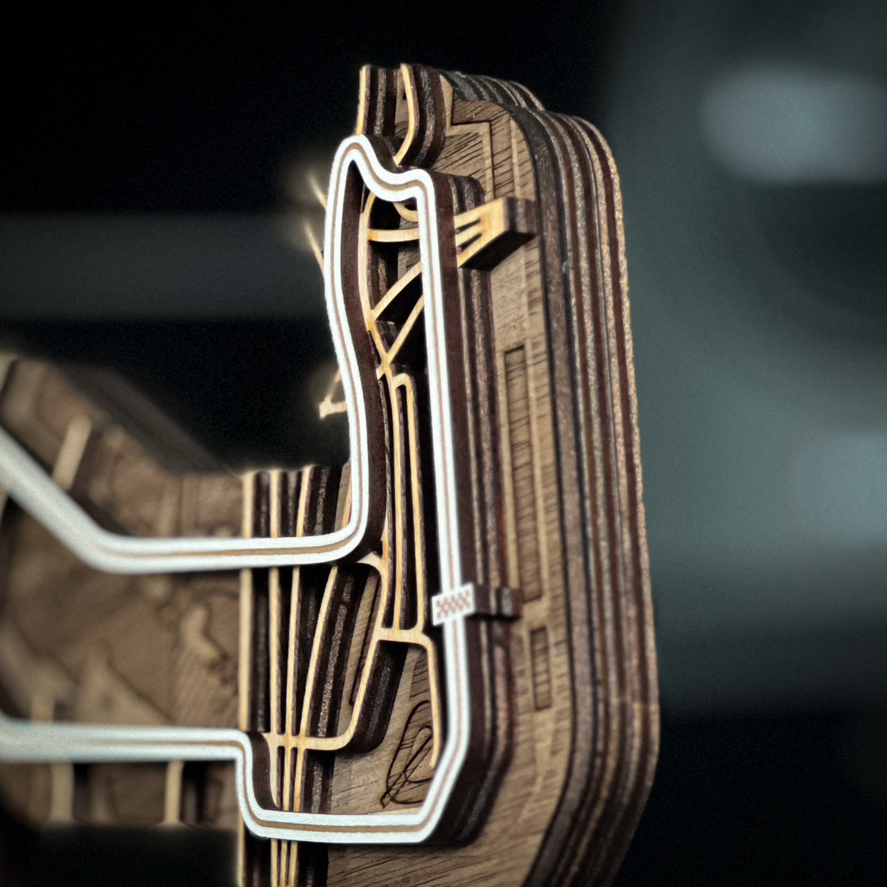 Feel the thrill of motorsport in your home or office. This 3D wooden racetrack artwork combines precision-cut beech roads with a walnut base, laser-engraved for stunning detail. The engraved racing stripe makes your track pop, creating a dynamic centerpiece that’s perfect for décor or gifting a motorsport fan.